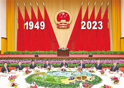 人民大會堂宴會廳華燈璀璨、鮮花綻放,洋溢著喜慶熱烈的節(jié)日氛圍。主席臺上方高懸著莊嚴的國徽,“1949—2023”大字年號在鮮艷的紅旗映襯下格外醒目。