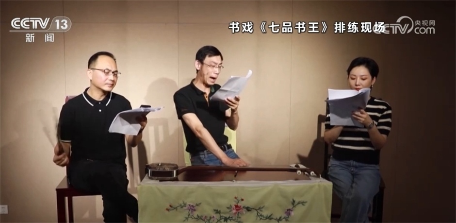 臺上正在排練的書戲叫《七品書王》,講述的是一名說書藝人王周士為乾隆皇帝表演,獲封七品書王,并且成立評彈藝人行會組織光裕公所的故事。蘇州市評彈團將這個傳統(tǒng)中篇彈詞創(chuàng)新性改編為書戲,不僅在表演人數(shù)、形式、內(nèi)容上都有所創(chuàng)新,劇本中還融入了現(xiàn)代詞匯,觀賞性更強。