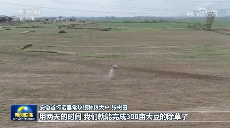 今年,皖北大豆主產(chǎn)區(qū)持續(xù)推進(jìn)單產(chǎn)提升行動(dòng)。在安徽懷遠(yuǎn)縣種糧大戶張樹田的300畝大豆田里,無人機(jī)、植保機(jī)正在除草。由于夏播時(shí)全部采用大豆根瘤菌拌種,豆苗出得更齊、更壯。