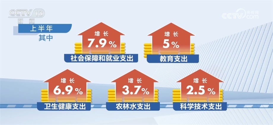 從支出看,上半年,全國一般公共預算支出133893億元,同比增長3.9%。其中,社會保障和就業(yè)支出增長7.9%,教育支出增長5%,衛(wèi)生健康支出增長6.9%,農(nóng)林水支出增長3.7%,科學技術支出增長2.5%,基本民生、鄉(xiāng)村振興、區(qū)域重大戰(zhàn)略、教育、科技攻關等重點支出得到有力保障。