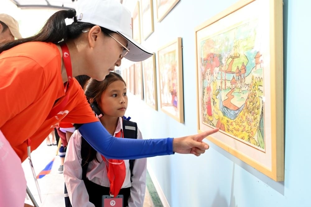 △2023年5月24日,乘坐中老鐵路國際旅客列車的百名老撾學(xué)生抵達(dá)中國云南西雙版納,和中國學(xué)生開展聯(lián)誼活動。圖為志愿者向老撾學(xué)生講解允景洪小學(xué)內(nèi)展出的學(xué)生畫作。