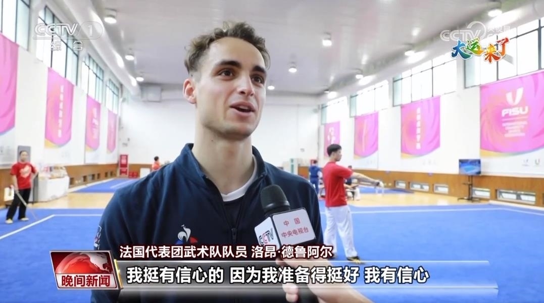 法國代表團武術隊隊員 洛昂·德魯阿爾:我要比賽的項目是長拳和棍術。我每天都會訓練,一天一般訓練兩次。我挺有信心的,因為我準備得挺好,我有信心。?