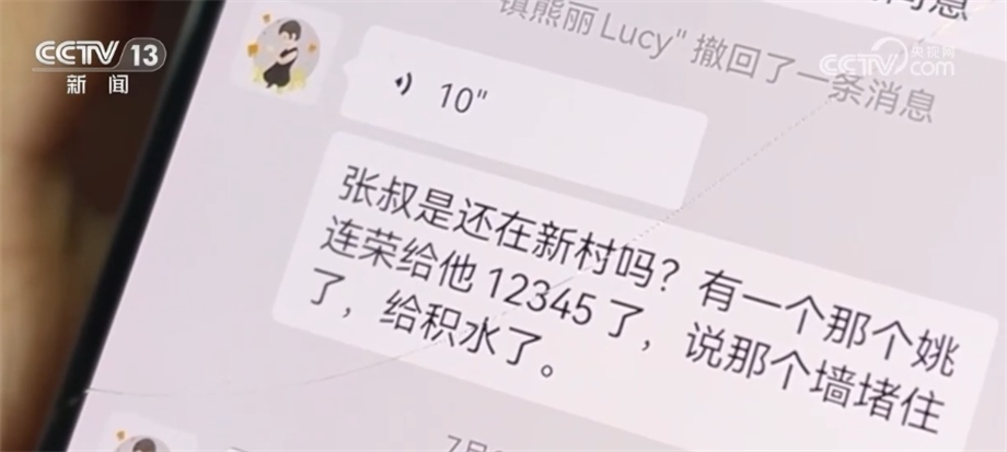 熊麗生前的微信語音:宗叔,是還在新村嗎?有一個(gè)姚連榮打12345了,說那個(gè)墻堵住了,給積水了。