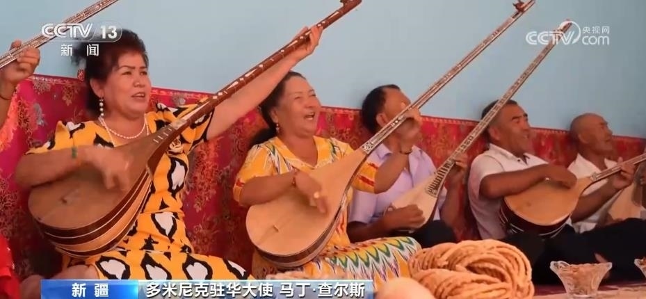 駐華使節(jié)們走進喀什古城的街市巷陌,感受當?shù)鬲毺氐拿褡逦幕?;在克孜爾千佛洞,領(lǐng)略跨越千年的石窟藝術(shù);來到新疆民間手工樂器制作第一村庫車市新和縣加依村,同當?shù)匕傩找黄疠d歌載舞;觀看非遺項目十二木卡姆等一系列活動,讓使節(jié)們感嘆,新疆少數(shù)民族傳統(tǒng)文化和生活習(xí)俗得到了充分保護。
