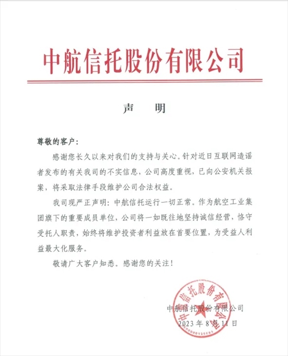 中航信托股份有限公司(下稱“中航信托”)在微信官方公眾號(hào)發(fā)文回應(yīng)稱,“針對(duì)近日互聯(lián)網(wǎng)造謠者發(fā)布的有關(guān)我司的不實(shí)信息,公司高度重視,已向公安機(jī)關(guān)報(bào)案,將采取法律手段維護(hù)公司合法權(quán)益。我司現(xiàn)嚴(yán)正聲明:中航信托運(yùn)行一切正常。作為航空工業(yè)集團(tuán)旗下的重要成員單位,公司將一如既往地堅(jiān)持誠信經(jīng)營(yíng),恪守受托人職責(zé),始終將維護(hù)投資者利益放在首要位置,為受益人利益最大化服務(wù)?!?/p>