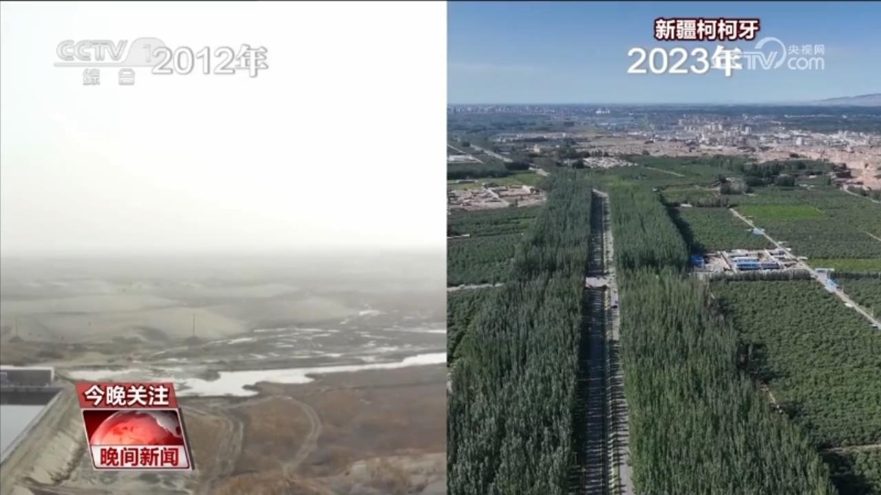 新疆阿克蘇地區(qū)的柯柯牙曾經(jīng)是南疆風(fēng)沙策源地之一。30年來,面對柯柯牙缺水和土壤鹽堿含量高的情況,當(dāng)?shù)叵到y(tǒng)推進(jìn)山水林田湖草沙一體化保護(hù)和系統(tǒng)治理,柯柯牙綠化工程造林共計120.26萬畝,累計栽植樹木1400萬株,荒漠變?yōu)榱趾?,最終在貧瘠的戈壁荒漠中,造就了一道“綠色長城”。