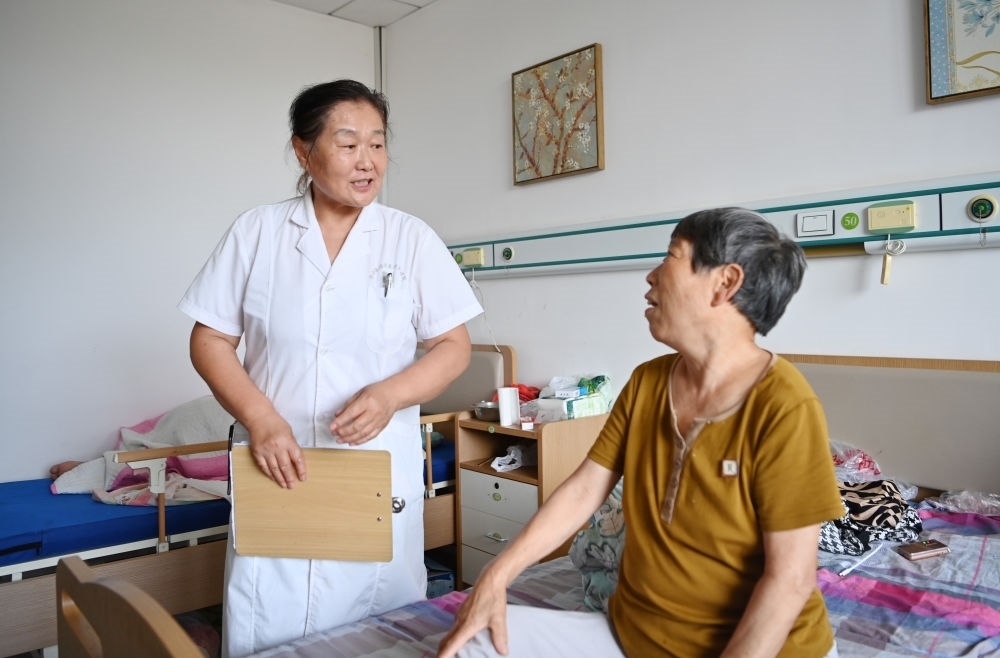 醫(yī)務(wù)人員在海福祥養(yǎng)老護(hù)理院安置點內(nèi)叮囑轉(zhuǎn)移老人用藥(8月9日攝)。新華每日電訊記者李然攝