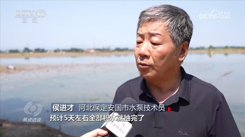 在河北涿州,多臺(tái)大型水泵正在對(duì)東城坊鎮(zhèn)的賈村、茂田莊村、徐家莊村的農(nóng)田抽排積水。