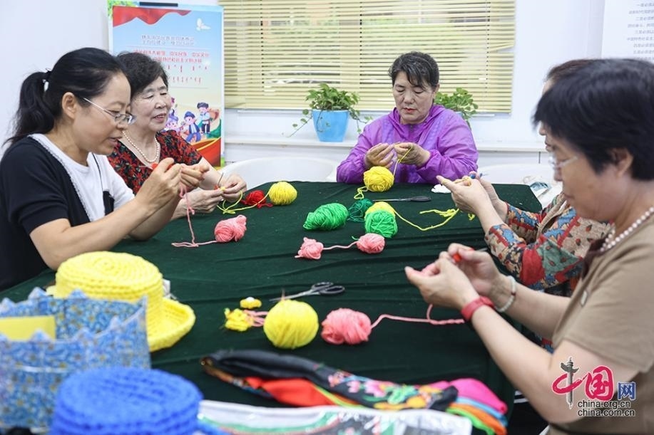 在臨潢家園社區(qū)便民服務中心內(nèi),各族居民制作手工編織藝術(shù)品。中國網(wǎng)記者 倫曉璇 攝