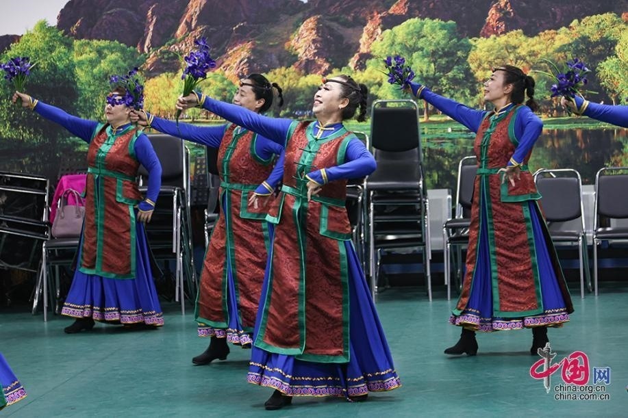 在臨潢家園社區(qū)便民服務中心內(nèi),由社區(qū)里各民族居民組成的烏蘭牧騎小分隊正在排練廳內(nèi)練習舞蹈。中國網(wǎng)記者 倫曉璇 攝