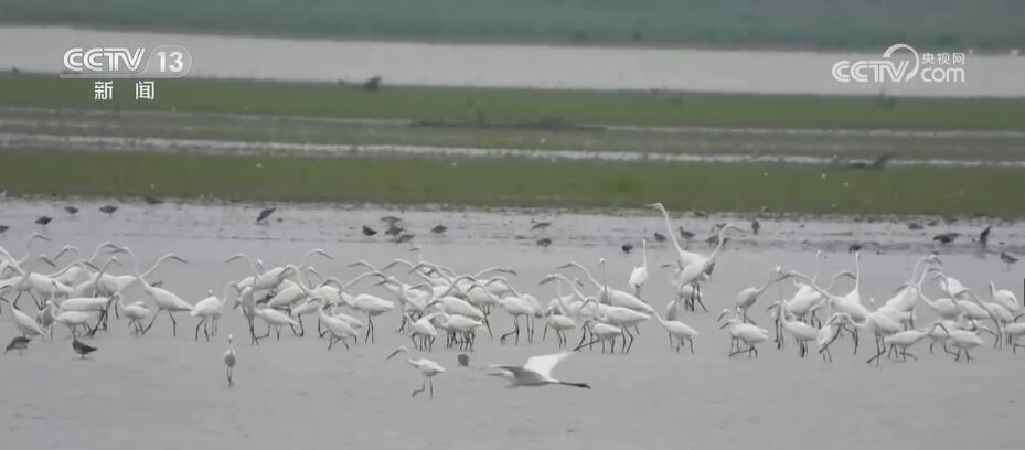 在江西南昌新建區(qū)南磯鄉(xiāng)的南山島附近水域,成群的鷺鳥、斑嘴鴨等候鳥在湖泊中集中覓食,并不時在空中盤旋列隊,準備南遷。今年夏季,鄱陽湖水位漲跌交替,湖內草洲沙灘顯露,為各種鳥類棲息覓食,提供了良好的環(huán)境。