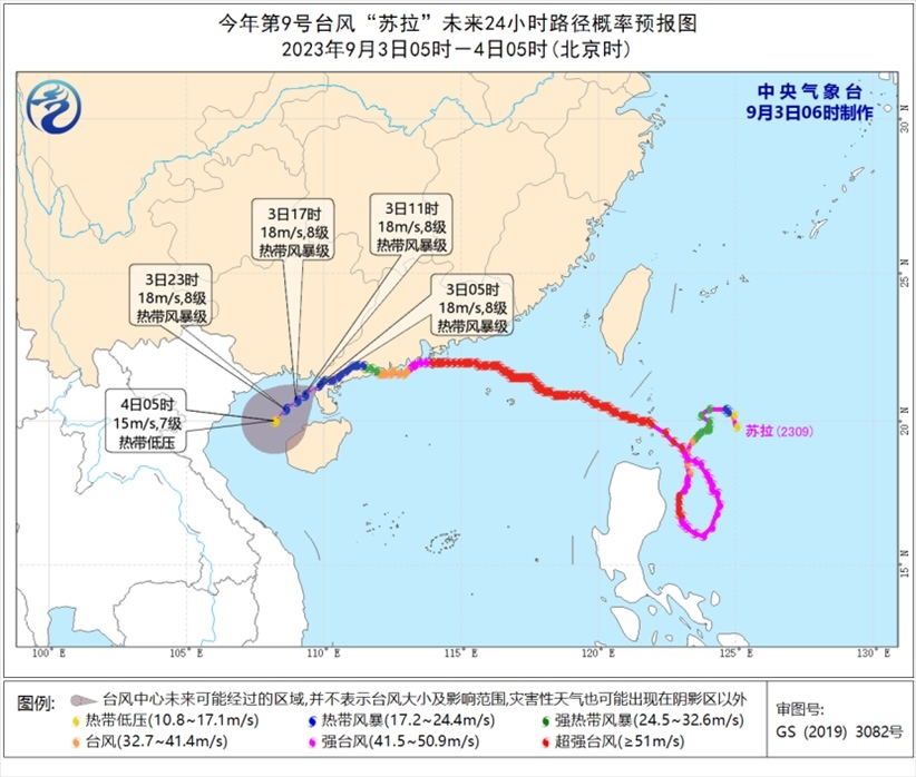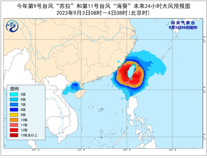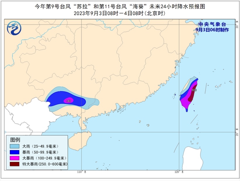 降水預(yù)報:9月3日08時至4日08時,受“蘇拉”和“海葵”影響,廣西中南部、廣東西南部、臺灣島等地部分地區(qū)有大到暴雨,其中,廣西中南部、臺灣島中東部等地部分地區(qū)有大暴雨,臺灣島東部部分地區(qū)有特大暴雨(250-600毫米)。