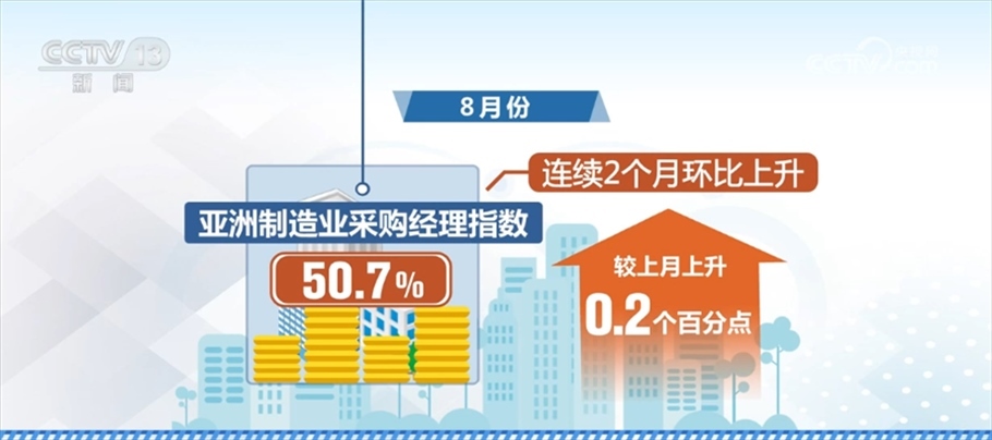 8月份,亞洲制造業(yè)采購經理指數為50.7%,較上月上升0.2個百分點,連續(xù)2個月環(huán)比上升,顯示亞洲制造業(yè)延續(xù)平穩(wěn)增長趨勢。從主要國家看,中國制造業(yè)采購經理指數連續(xù)三個月上升,向好回升勢頭進一步鞏固,中國制造業(yè)呈現持續(xù)穩(wěn)定恢復趨勢,為亞洲制造業(yè)的平穩(wěn)增長提供重要支撐。