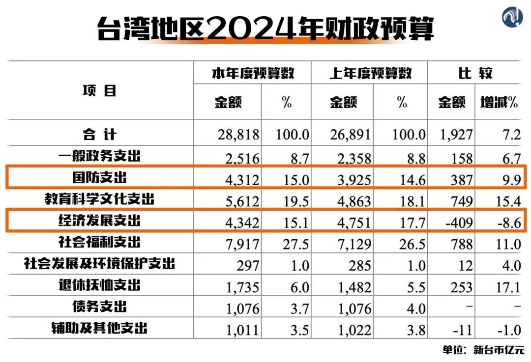 民進黨當(dāng)局不久前通過的2024年財政預(yù)算案就很能說明問題。各項支出中,防務(wù)支出繼續(xù)保持增長,經(jīng)濟發(fā)展支出卻是所有領(lǐng)域中跌幅最大的。
