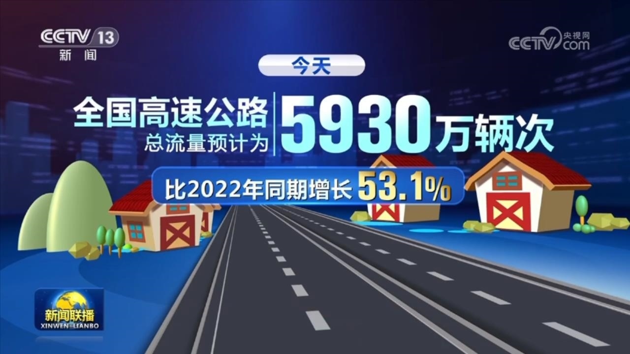 今天,全國高速公路總流量預(yù)計(jì)為5930萬輛次,比2022年同期增長53.1%。