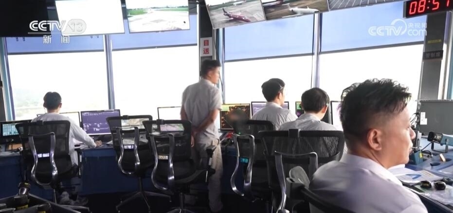這里就是控制整個機場航班的“中樞”所在——空管塔臺,伴隨著一句句簡短的指令發(fā)出,一架架滿載著旅客的客機有序起降。管制員們一邊緊盯電腦雷達顯示器,一邊查看機場跑道情況,指揮調(diào)控飛機的飛行線路和高度。