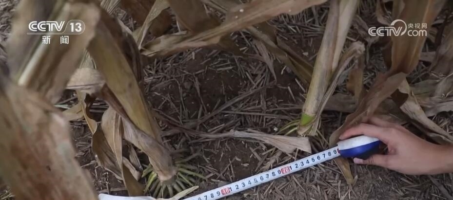 我們扒開田里的玉米看一下,可以看到玉米色澤金黃,而且顆粒飽滿,這說明玉米的品質(zhì)是非常好的。除此之外,這個玉米品種還有一個特點就是耐密。一般的玉米株距在28—30cm,我們拿尺子測量一下,玉米株距大約在24cm,相對一般玉米比較小,這樣每畝地種植的玉米株數(shù)更多,產(chǎn)量也就相對較高。
