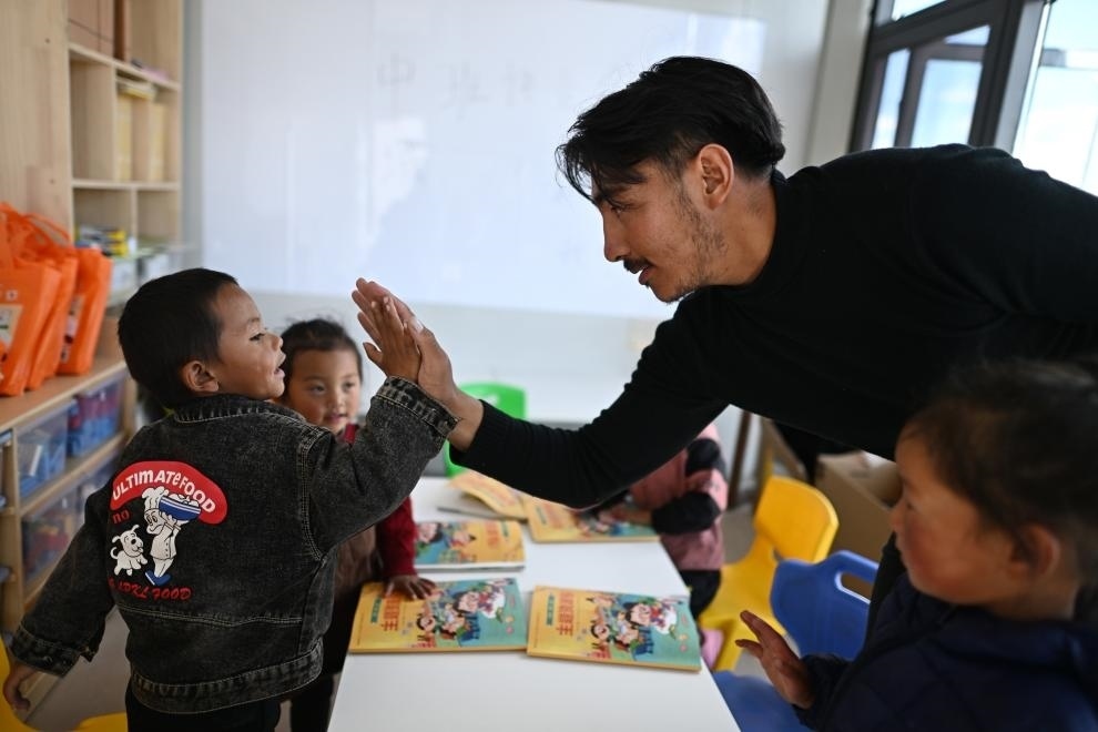 ?在曲麻萊縣秋智鄉(xiāng)布甫村陽光幼兒園,秋智鄉(xiāng)幼兒園副園長才仁戰(zhàn)斗(右二)在課堂上和小朋友互動(9月14日攝)。新華社記者 張宏祥 攝