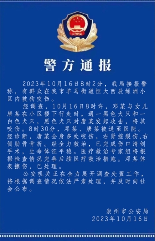 ·四川一小區(qū)兩大型犬撕咬兩歲半女童,致女童背部撕咬傷,腎部挫裂傷。警方:正全力展開(kāi)調(diào)查處置工作。