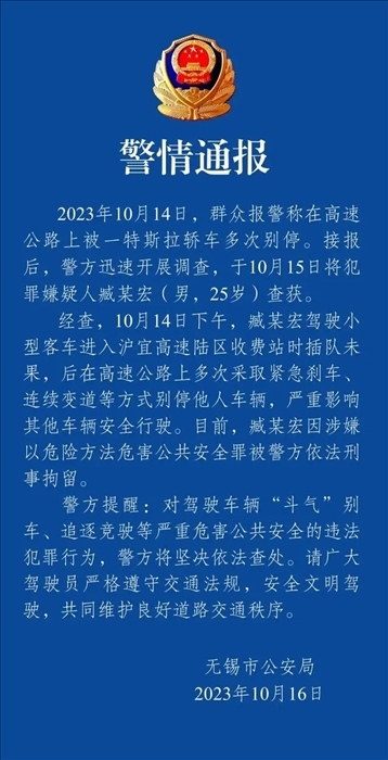 ·特斯拉插隊(duì)未果多次在高速上逼停同一車(chē)輛,無(wú)錫警方:司機(jī)涉嫌危害公共安全罪,刑拘!