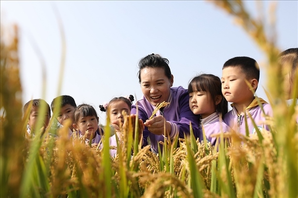 10月16日, 世界糧食日。山東臨沂沂南縣大莊鎮(zhèn),小朋友在稻田聽(tīng)老師講解水稻種植知識(shí)。