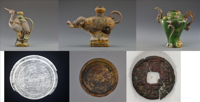 一號(hào)沉船遺址有多個(gè)隔艙的船貨堆積,包括陶器、瓷器、銅器、鐵器、竹木器等,數(shù)量超十萬(wàn)件,代表性器物有醬釉陶罐,琺華梅瓶,青花執(zhí)壺、玉壺春瓶,紅綠彩碗、盤(pán)、杯,青釉玉壺春瓶,青白釉盤(pán)、碗,白釉三足圓香爐,藍(lán)釉高足碗,單色釉玉壺春瓶、扁壺,素三彩螺形壺、象形壺、鶴形壺,鐵鍋,銅盤(pán)、銅錢(qián)等。二號(hào)沉船遺址發(fā)現(xiàn)大量尺寸相近、碼放整齊的原木及少量陶器、瓷器、蠑螺殼等。