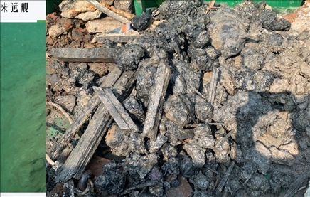 沉船遺址水深約30米,主體區(qū)域殘存有木質(zhì)船體和成摞擺放的船貨堆積,范圍約300平方米??脊虐l(fā)掘發(fā)現(xiàn),沉船船體殘長(zhǎng)約16.95米,最寬處保存約4.5米,殘存9道隔艙板和10個(gè)船艙,單層板結(jié)構(gòu),發(fā)現(xiàn)桅座、龍骨板、龍骨補(bǔ)強(qiáng)材以及舭龍骨等船體構(gòu)件。