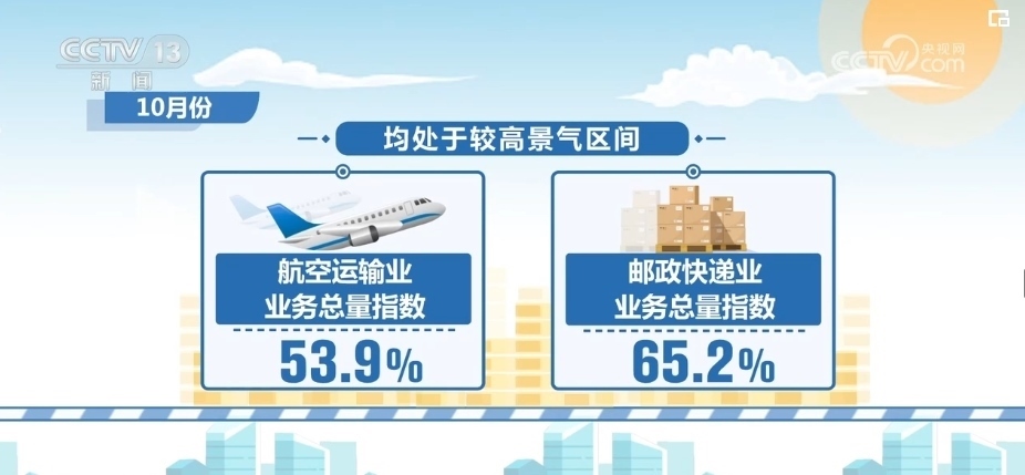 10月份,航空運輸業(yè)業(yè)務總量指數為53.9%,郵政快遞業(yè)業(yè)務總量指數為65.2%,均處于較高景氣區(qū)間。