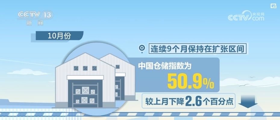 10月份,中國倉儲指數為50.9%,較上月下降2.6個百分點,連續(xù)9個月保持在擴張區(qū)間。