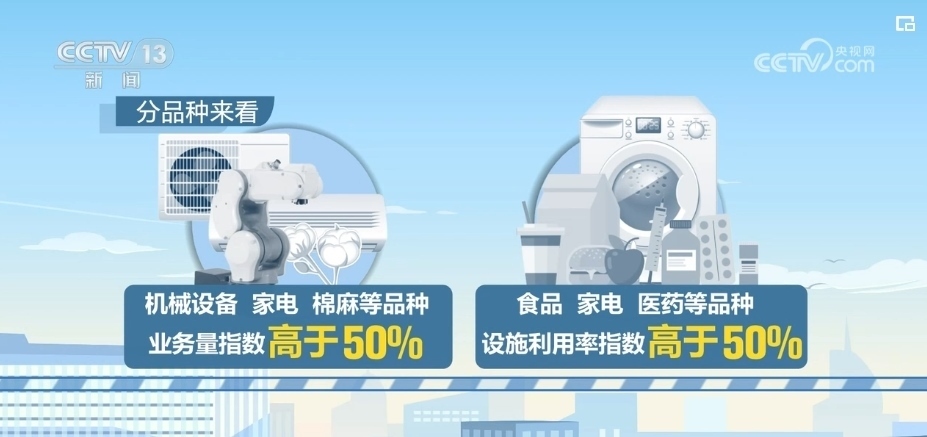 分品種來看,機械設備、家電、棉麻等品種的業(yè)務量指數高于50%;食品、家電、醫(yī)藥等品種的設施利用率指數高于50%。