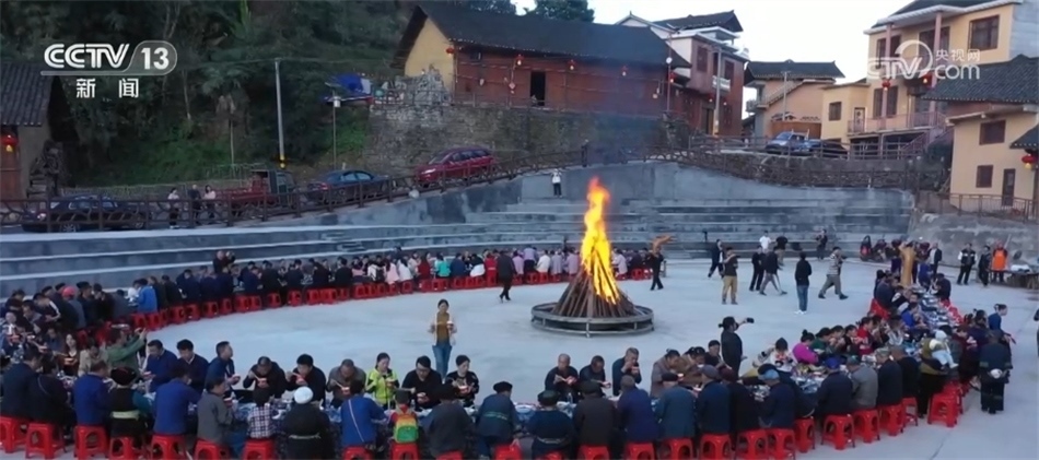 這天是十八洞村一個(gè)重要的日子,村里人聚在一起點(diǎn)起了篝火,擺起了長龍宴,見證苗家文化廣場(chǎng)投入使用。