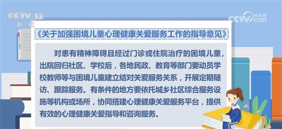 對患有精神障礙且經過門診或住院治療的困境兒童,出院回歸社區(qū)、學校后,各地民政、教育等部門要動員學校教師等與困境兒童建立結對關愛服務關系,開展定期隨訪、跟蹤服務。有條件的地方要依托城鄉(xiāng)社區(qū)綜合服務設施等機構或場所,協(xié)同搭建心理健康關愛服務平臺,提供有效的心理健康關愛指導和咨詢服務。