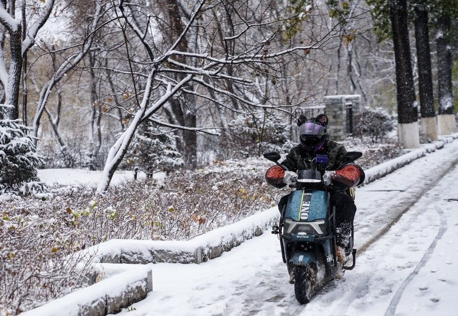 11月6日,在長(zhǎng)春市街頭,一名外賣(mài)員在雪中騎行。新華社記者 許暢 攝
