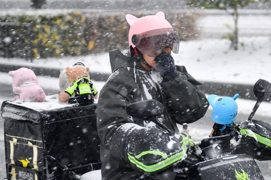11月6日,外賣(mài)員在長(zhǎng)春市延安大街上冒雪配送外賣(mài)。新華社記者 顏麟蘊(yùn) 攝