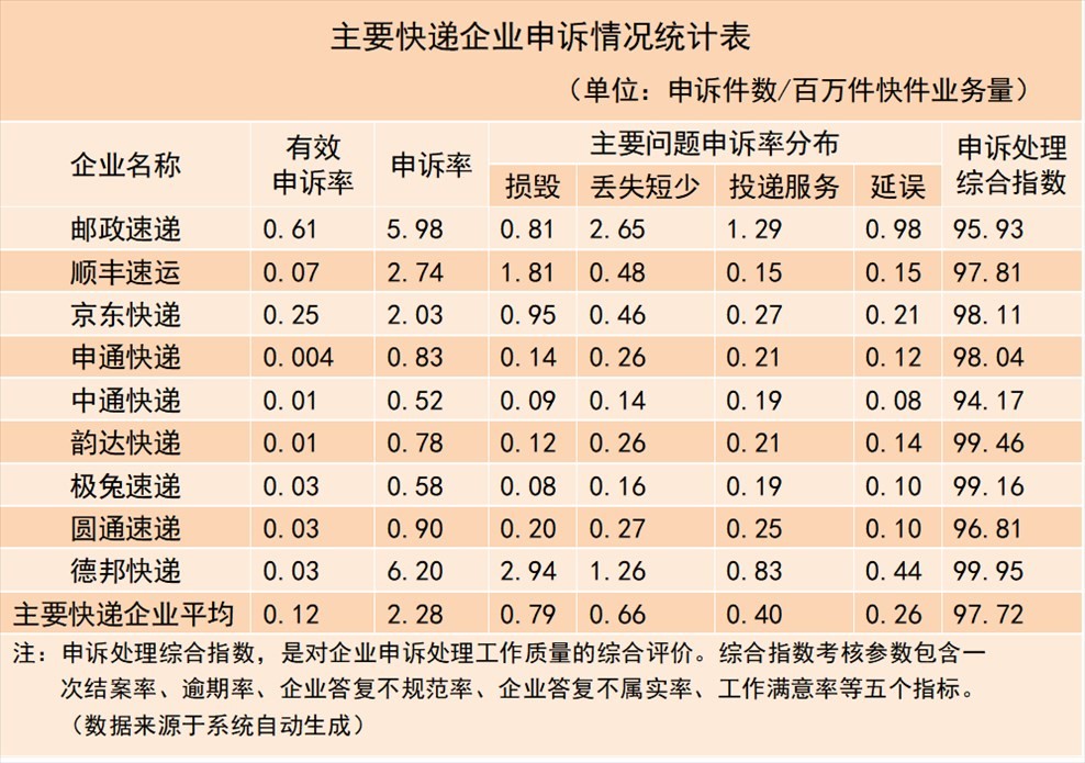 3.主要快遞企業(yè)申訴情況。主要快遞企業(yè)申訴率(百萬件快件業(yè)務(wù)量)平均為2.28,有效申訴率平均為0.12。用戶對快遞服務(wù)申訴主要問題中,快件損毀申訴率平均為0.79,快件丟失短少申訴率平均為0.66,投遞服務(wù)申訴率平均為0.40,快件延誤申訴率平均為0.26;主要快遞企業(yè)申訴處理綜合指數(shù)平均為97.72,高于平均值的有6家,低于平均值的有3家。
