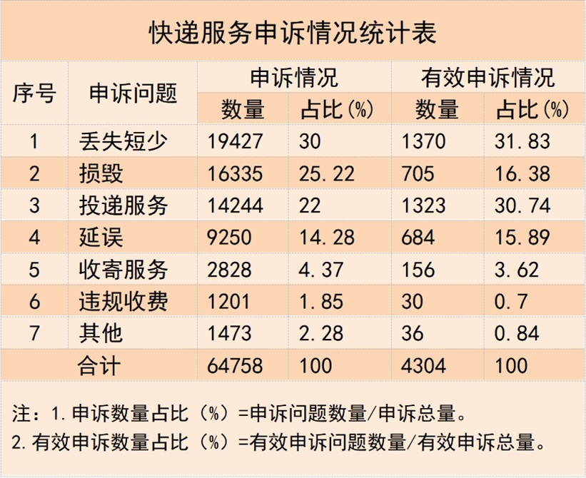 三、快遞服務(wù)申訴情況1.快遞服務(wù)申訴問題數(shù)量與類別情況。用戶對快遞服務(wù)問題申訴64758件,其中有效申訴4304件,占比6.65%。有效申訴涉及的主要問題依次是快件丟失短少、投遞服務(wù)和快件損毀,分別占有效申訴總量的31.83%、30.74%和16.38%。