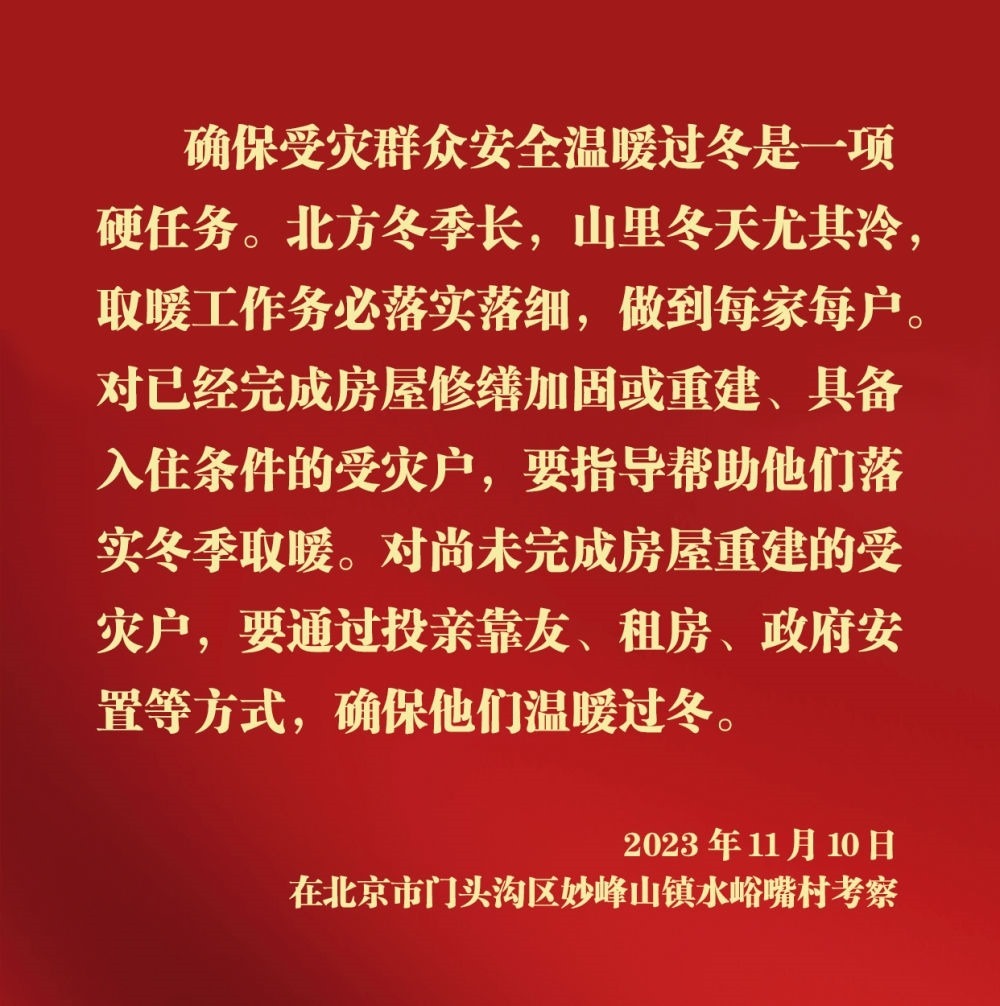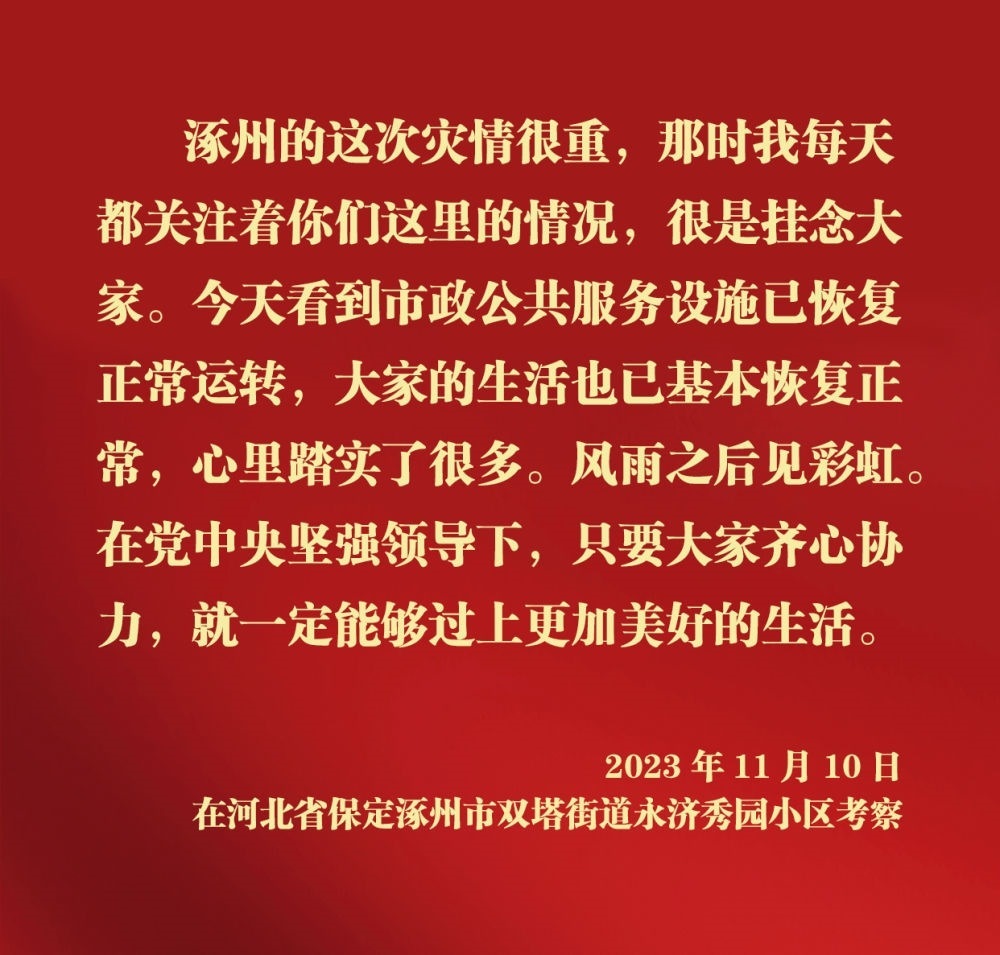 11月10日,中共中央總書記、國家主席、中央軍委主席習近平在北京、河北考察災后恢復重建工作。他先后來到門頭溝、保定等地,實地了解災后恢復重建情況。
