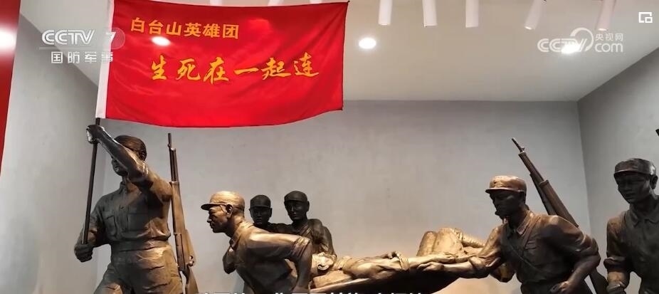 軍事記者 張喬普:在這個(gè)旅的旅史長(zhǎng)廊,在我身旁的這些櫥窗,我看到了包括“生死在一起”連在內(nèi)的,一共17個(gè)英模單位的旗幟。這一面面鮮紅的戰(zhàn)旗,見(jiàn)證、記錄了這個(gè)旅代代官兵一路從抗日戰(zhàn)爭(zhēng)時(shí)期到抗美援朝浴血奮戰(zhàn)、英勇無(wú)畏的戰(zhàn)斗足跡。其中最引人注目的就是我身旁的這面“白臺(tái)山英雄團(tuán)”的戰(zhàn)旗。這面戰(zhàn)旗曾參加國(guó)慶70周年閱兵,在天安門廣場(chǎng)接受黨和人民的檢閱。而她的精神內(nèi)核,就是“生死在一起”。