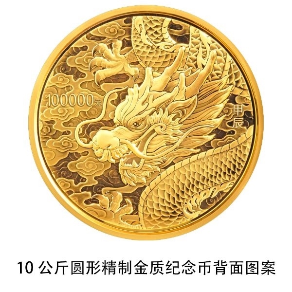 10公斤圓形金質(zhì)紀(jì)念幣背面圖案為龍造型,襯以祥云組合設(shè)計。