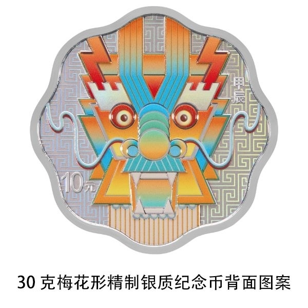 30克梅花形銀質(zhì)紀(jì)念幣背面圖案為裝飾龍造型,襯以回紋紋飾。