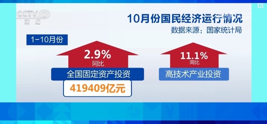 從投資來(lái)看,固定資產(chǎn)投資規(guī)模繼續(xù)擴(kuò)大。1—10月份,全國(guó)固定資產(chǎn)投資419409億元,同比增長(zhǎng)2.9%。其中,高技術(shù)產(chǎn)業(yè)投資同比增長(zhǎng)11.1%,增長(zhǎng)較快。