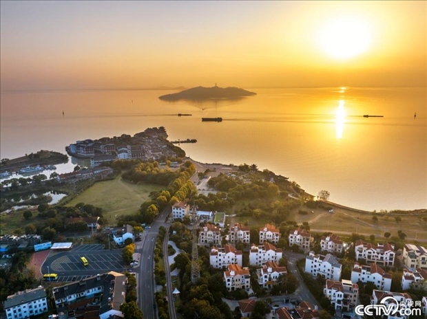 2023年11月14日,合肥,夕陽西下,裝載貨物的船只在合裕線航道巢湖湖區(qū)有序航行。