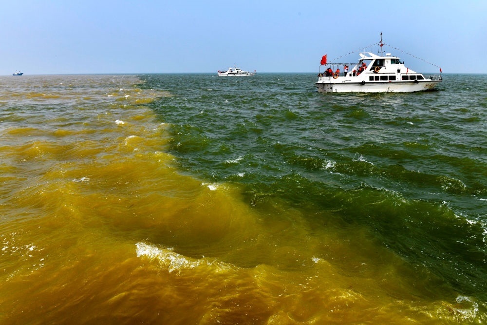 在山東省東營市黃河入??冢S河匯入渤海,形成獨特景觀(2021年5月13日攝)。