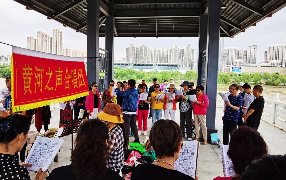 在蘭州市城關(guān)區(qū)黃河治理蘭鐵泵站項目點,黃河之聲合唱團開展合唱活動(2020年6月15日攝)。