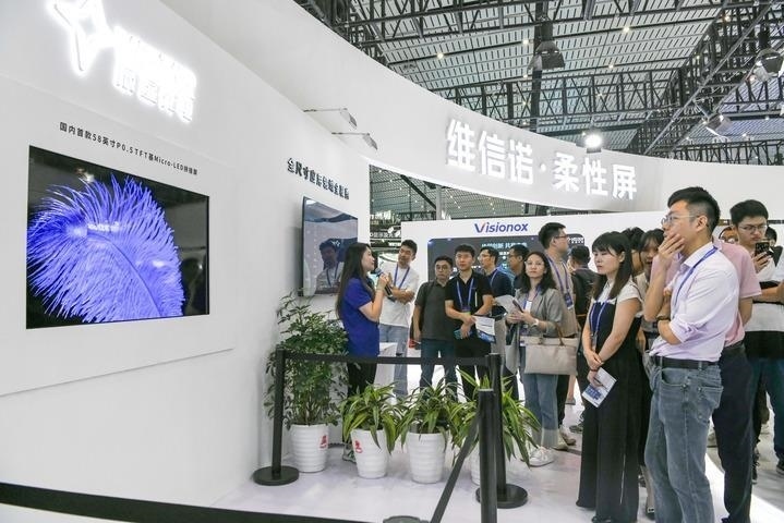在“2023世界顯示產(chǎn)業(yè)大會(huì)新型顯示創(chuàng)新成果展”現(xiàn)場(chǎng),觀眾在觀看58英寸P0.5TFT基Micro-LED拼接屏(2023年9月7日攝)。新華社記者 唐文豪 攝
