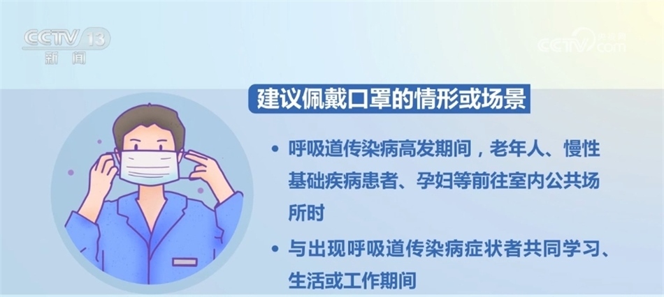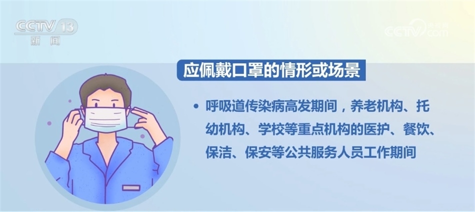 《指引》明確,應(yīng)佩戴口罩的情形或場(chǎng)景包括:新冠病毒感染、流感、肺炎支原體感染、呼吸道合胞病毒感染等呼吸道傳染病感染者前往室內(nèi)公共場(chǎng)所或與他人近距離接觸時(shí)。出現(xiàn)發(fā)熱、咳嗽、流涕、咽痛、肌肉酸痛、乏力等呼吸道傳染病癥狀者前往室內(nèi)公共場(chǎng)所或與他人近距離接觸時(shí)。前往醫(yī)療機(jī)構(gòu)就診、陪診、陪護(hù)、探視時(shí)。呼吸道傳染病高發(fā)期間,外來人員進(jìn)入養(yǎng)老機(jī)構(gòu)、社會(huì)福利機(jī)構(gòu)、托幼機(jī)構(gòu)等脆弱人群集中場(chǎng)所時(shí)。呼吸道傳染病高發(fā)期間,養(yǎng)老機(jī)構(gòu)、托幼機(jī)構(gòu)、學(xué)校等重點(diǎn)機(jī)構(gòu)的醫(yī)護(hù)、餐飲、保潔、保安等公共服務(wù)人員工作期間。