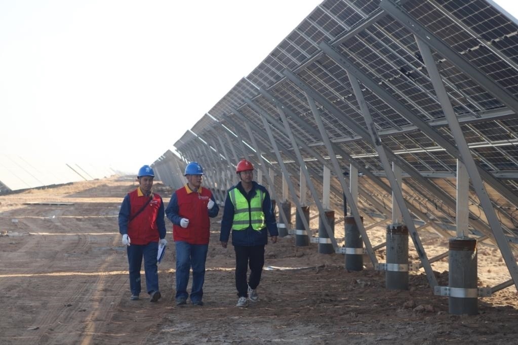 12月8日,國網(wǎng)阿克蘇供電公司工作人員來到國家電投阿拉爾光伏一電站進(jìn)行隱患排查。(馬海驕 攝)