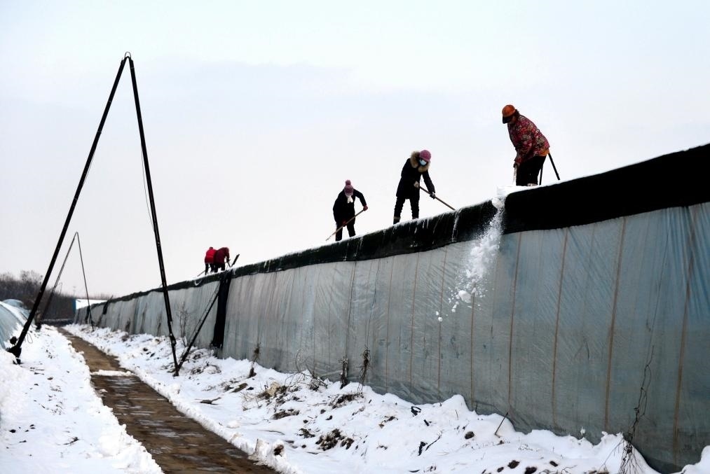 12月11日,河北省石家莊市欒城區(qū)崗頭村種植戶在清理大棚上的積雪。新華社記者 王曉 攝
