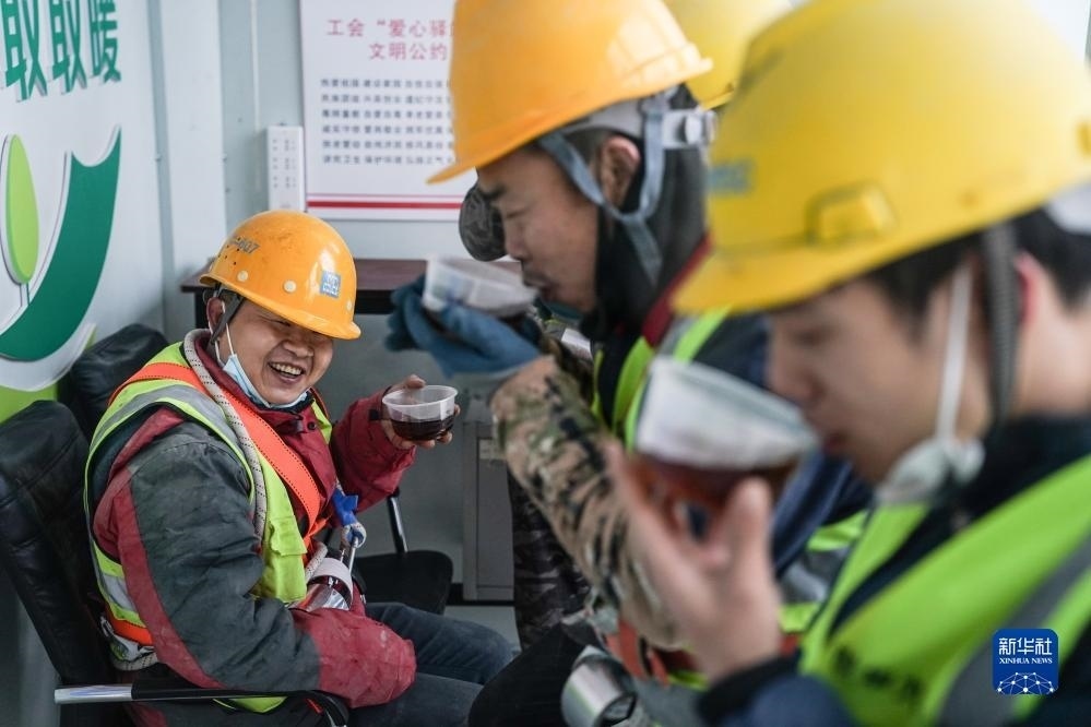 12月12日,在中建二局北方公司天津泰康項目工地,工人在飲用為他們準備的紅糖姜茶驅(qū)寒。