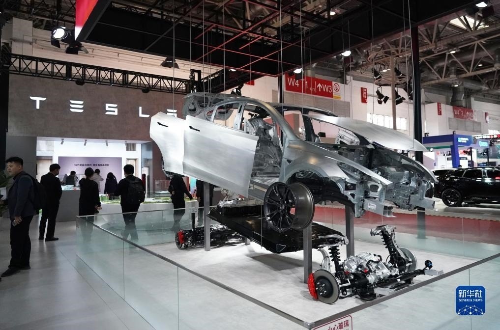 這是首屆中國國際供應(yīng)鏈促進(jìn)博覽會(huì)智能汽車鏈展區(qū)的特斯拉展位(2023年11月30日攝)。新華社記者 任超 攝